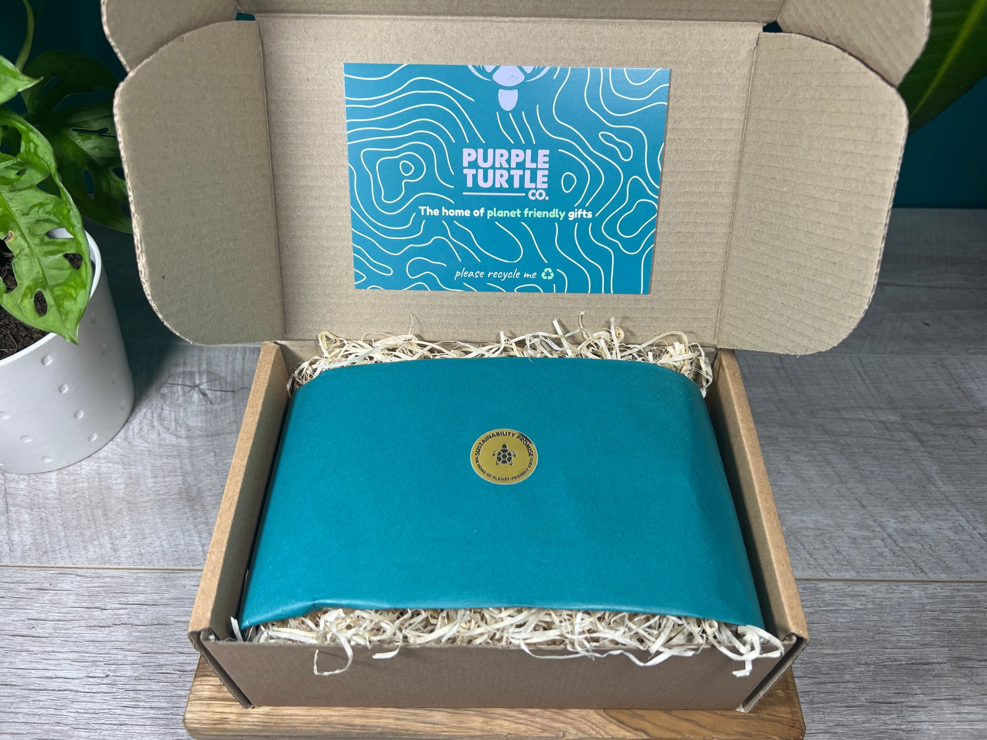 Send a beautifully handcrafted candle, made with our planet in mind. Made from sustainable soy wax, using a luxury glass holder, that can be washed and reused for many different purposes once the candle is finished. There are 3 different scents, fresh bamboo (fresh), pure peach (sweet), and soft lavender (floral). Each comes carefully hand gift-wrapped ready to gift in one of our iconic Purple Turtle Co gift boxes.